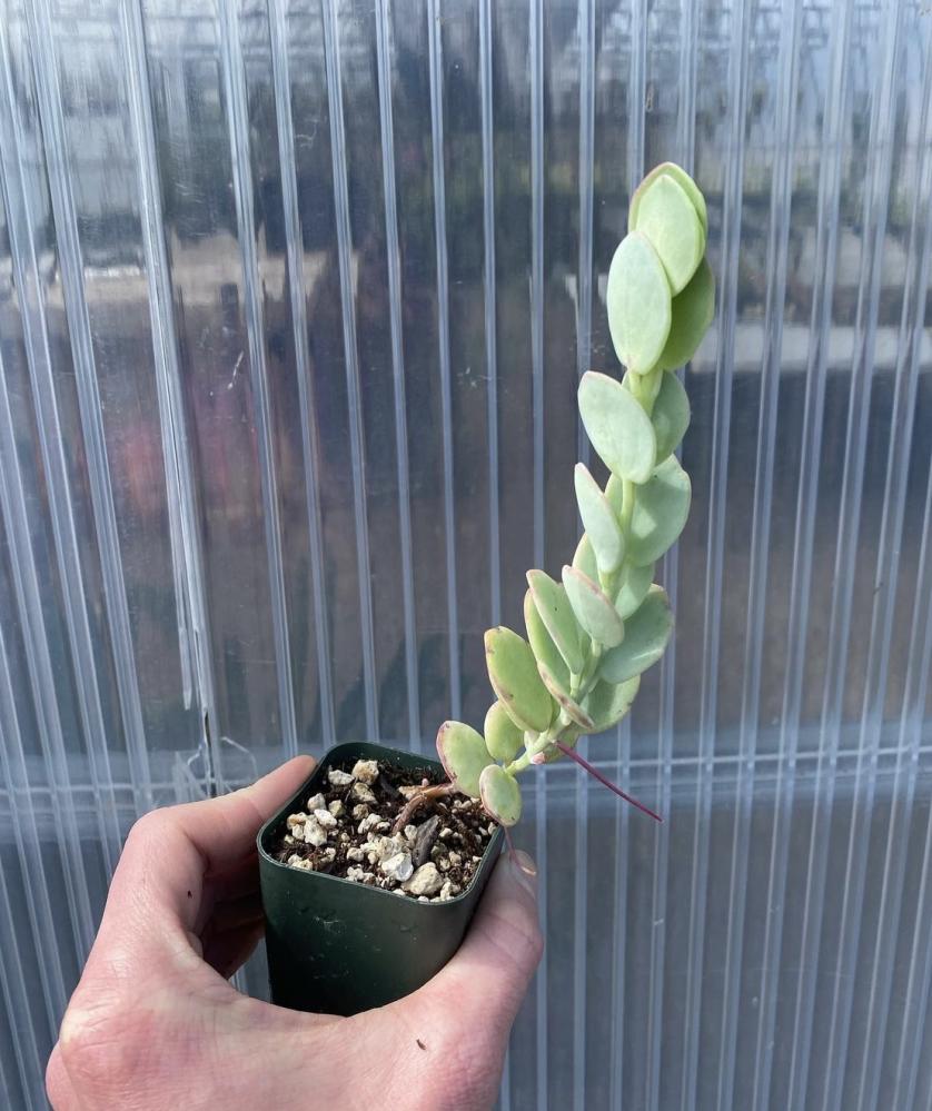 نبتة عصارية فريدة، تُعرف بأوراقها المستديرة المسطّحة المتراصة بشكل أنيق على طول الساق، بلون أزرق–رمادي مائل للخضرة، وتتخلل الحواف ألوان وردية أو بنفسجية في الإضاءة الجيدة. نبتة جريئة وعصرية، تضيف مظهر هندسي غريب وجميل لأي مساحة.