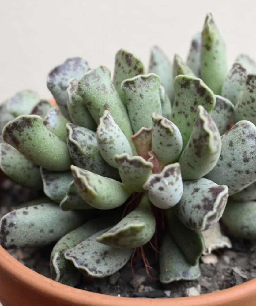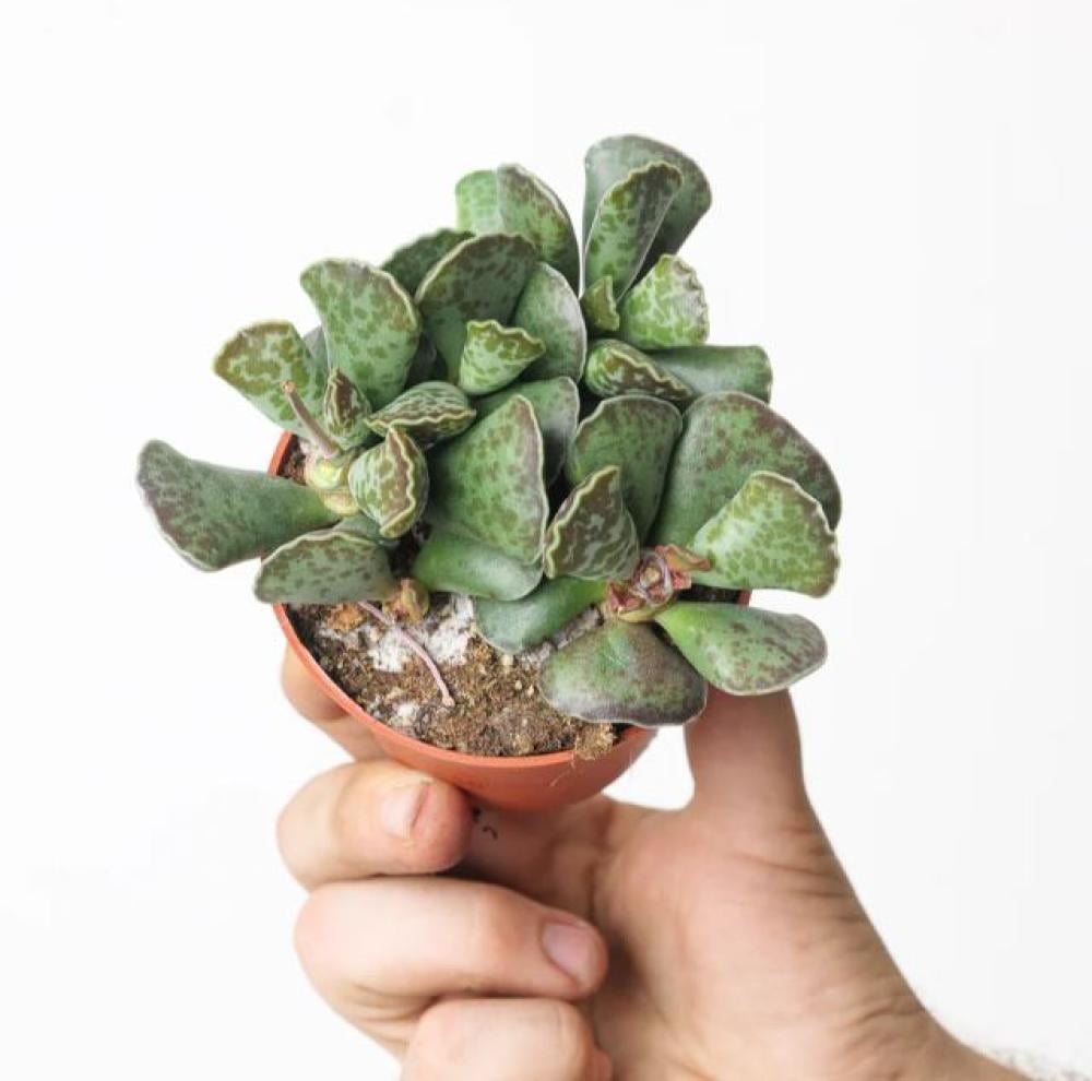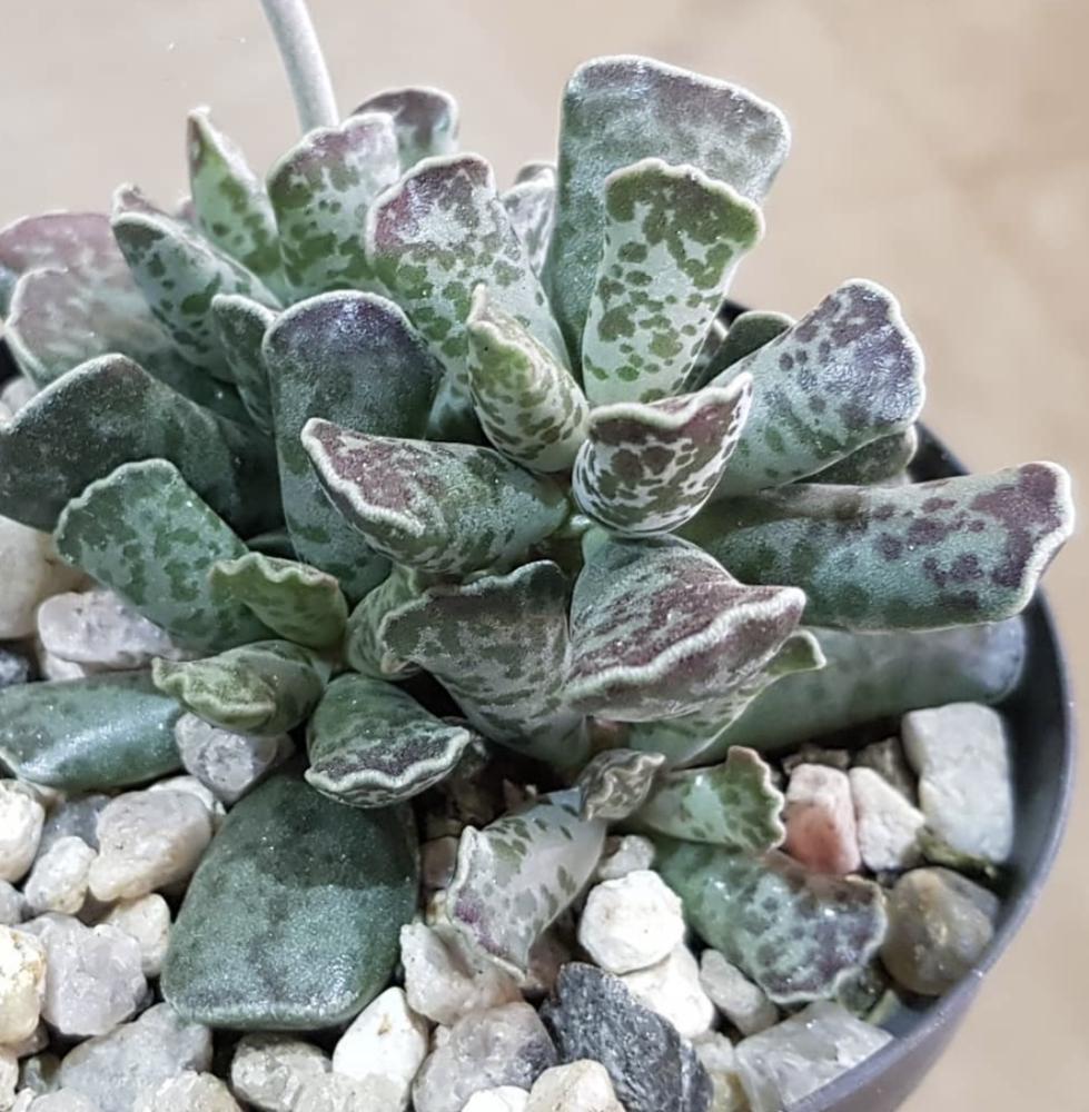 نبتة عصارية صغيرة ونادرة من جنوب أفريقيا، تتميز بأوراق سميكة ومجعدة على شكل لسان، بلون رمادي مائل للأخضر مع بقع أو نقاط أرجوانية أو بنفسجية، مما يعطيها مظهر فني وغريب في نفس الوقت. شكلها المضغوط يجعلها مثالية للتيراريومات أو أصص الزينة الصغيرة.
