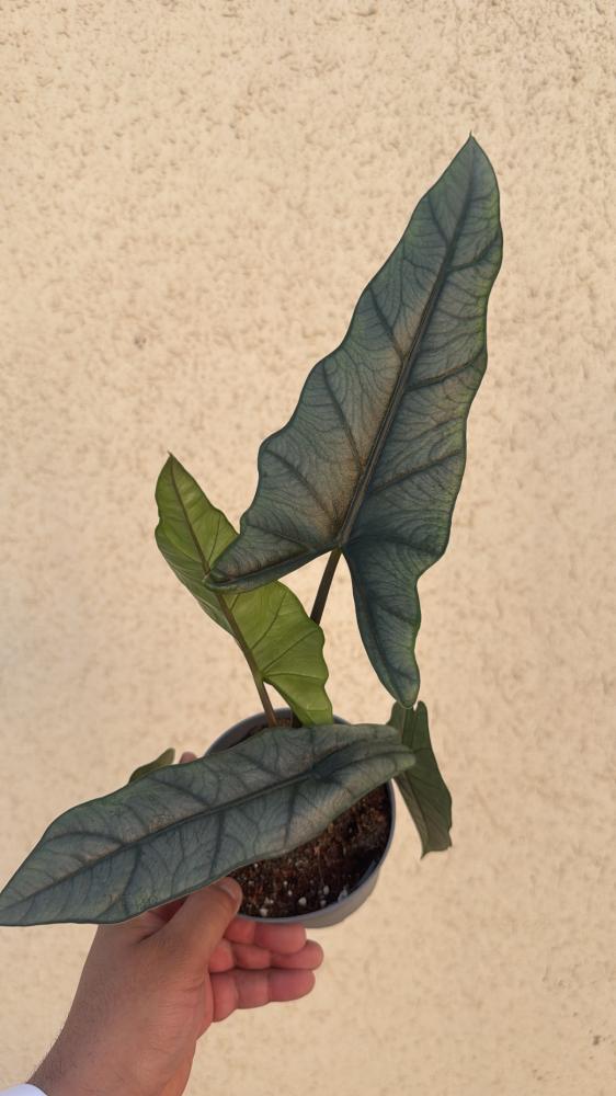 من أندر وأجمل أنواع الألوكاسيا، أوراقها جذابة بشكل فريد بلون أزرق معدني يميل للرمادي العميق، تعكس الضوء بطريقة رائعة تعطي لمعة مميزة وكأنها مغطاة بطبقة معدنية. شكل الورقة سهمي أنيق، وتكبر تدريجيًا لتصبح تحفة نباتية ملفتة في أي مكان توضع فيه.