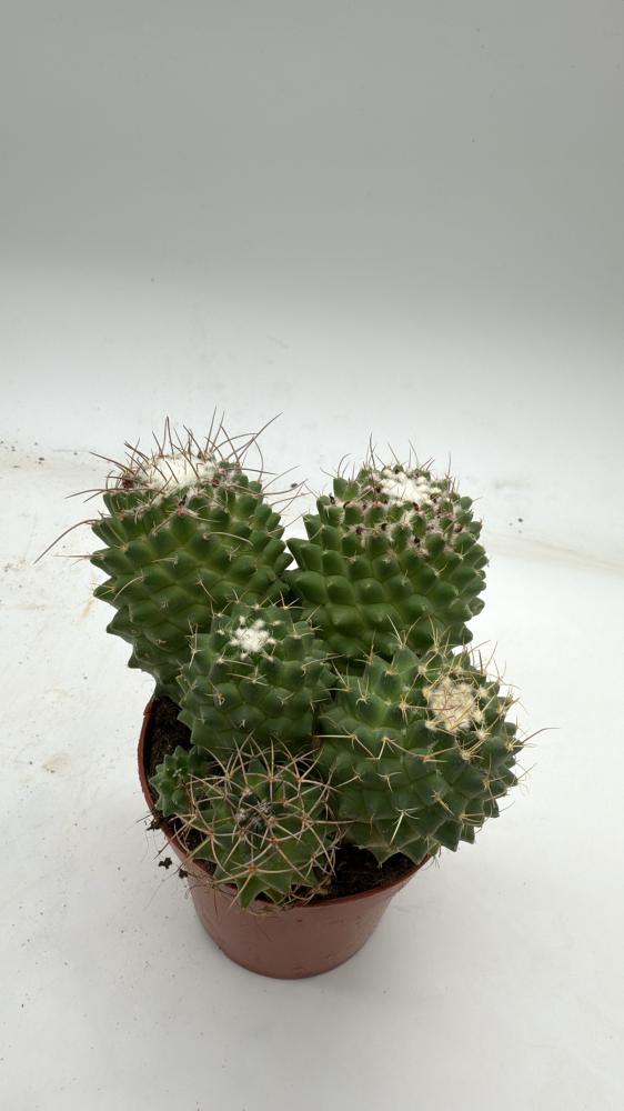 - الشكل: صبار كروي إلى أسطواني، أخضر داكن، مغطى بنتوءات مخروطية صغيرة (tubercles) تخرج منها أشواك بيضاء أو رمادية رفيعة.