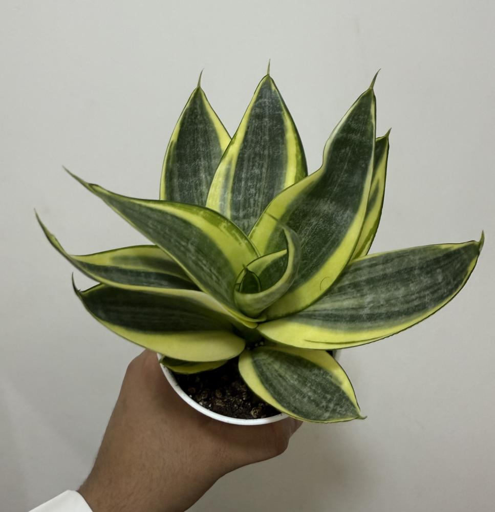 نبتة قوية وصغيرة الحجم من عائلة السانسيفيريا، تتميز بأوراقها القصيرة المرتبة بشكل وردي (Rosette) مع تدرجات ذهبية/صفراء على الحواف وخطوط خضراء في الوسط. مظهرها الأنيق يجعلها مثالية للطاولات والمكاتب والمساحات الصغيرة.