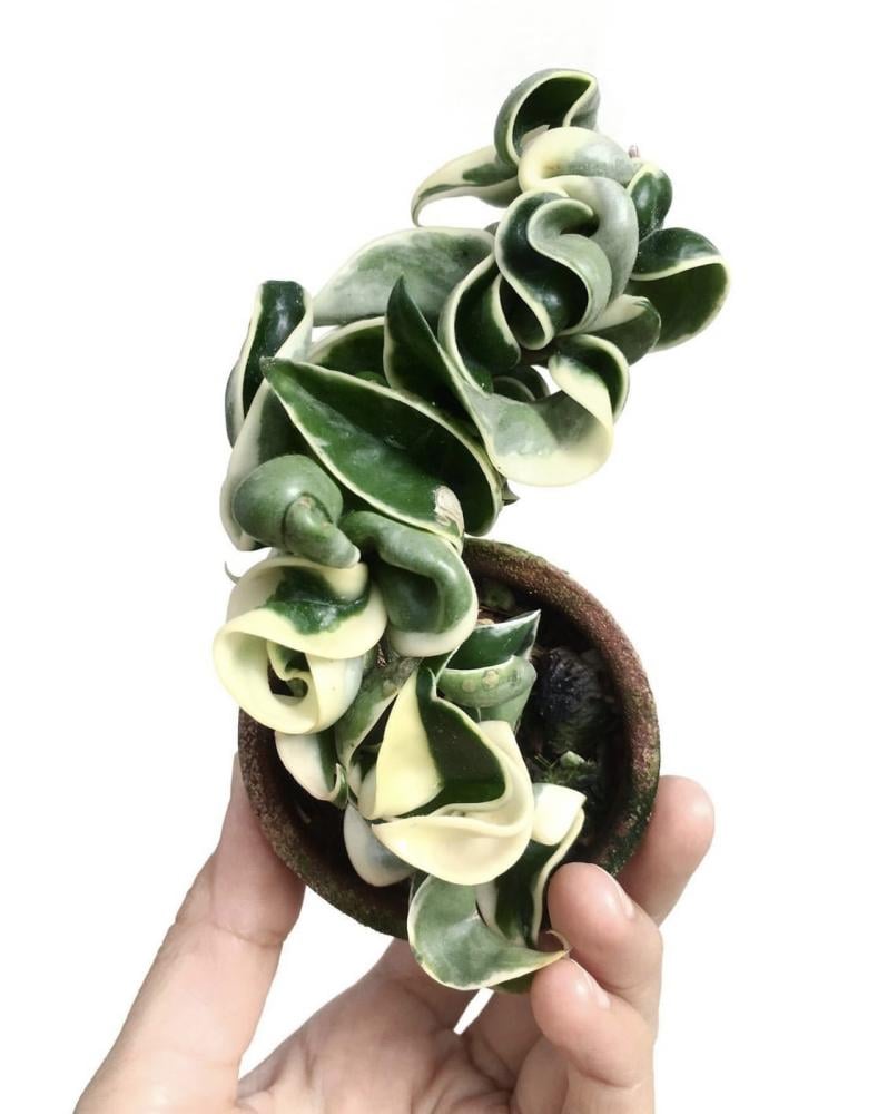 واحدة من أجمل وأندر أنواع الهويا، تتميز بأوراق ملتفة ومجعدة بشكل حلزوني فريد، بألوان مبهرة تجمع بين الأخضر والدرجات الكريمية أو الصفراء الفاتحة. مظهرها يعطي إحساسًا بالحركة والتجعيد، ومع العناية الجيدة تُزهر بزهور شمعية جميلة بلون وردي باهت وعطر خفيف.