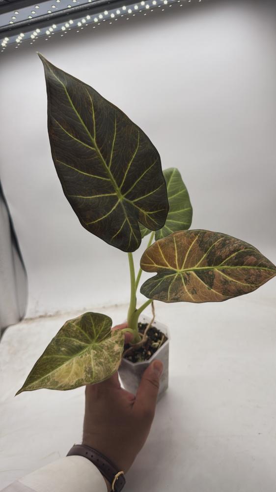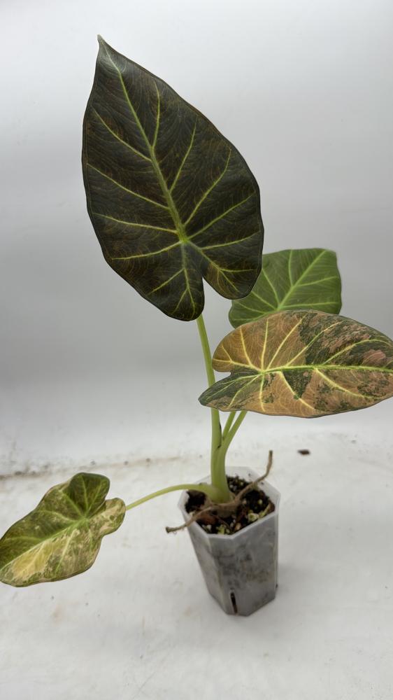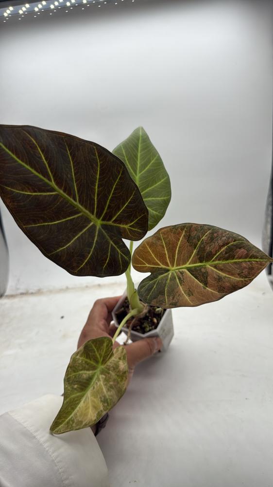 نبتة نادرة جدًا من الألوكاسيا، أوراقها كبيرة مخملية الملمس باللون الأخضر العميق مع عروق بارزة، يزينها تباين فارفيقاتد باللون الوردي الذي يضفي عليها لمسة فاخرة لا تتكرر. شكل الأوراق شبيه بالدرع، ما يجعلها نبتة عرضية استثنائية.