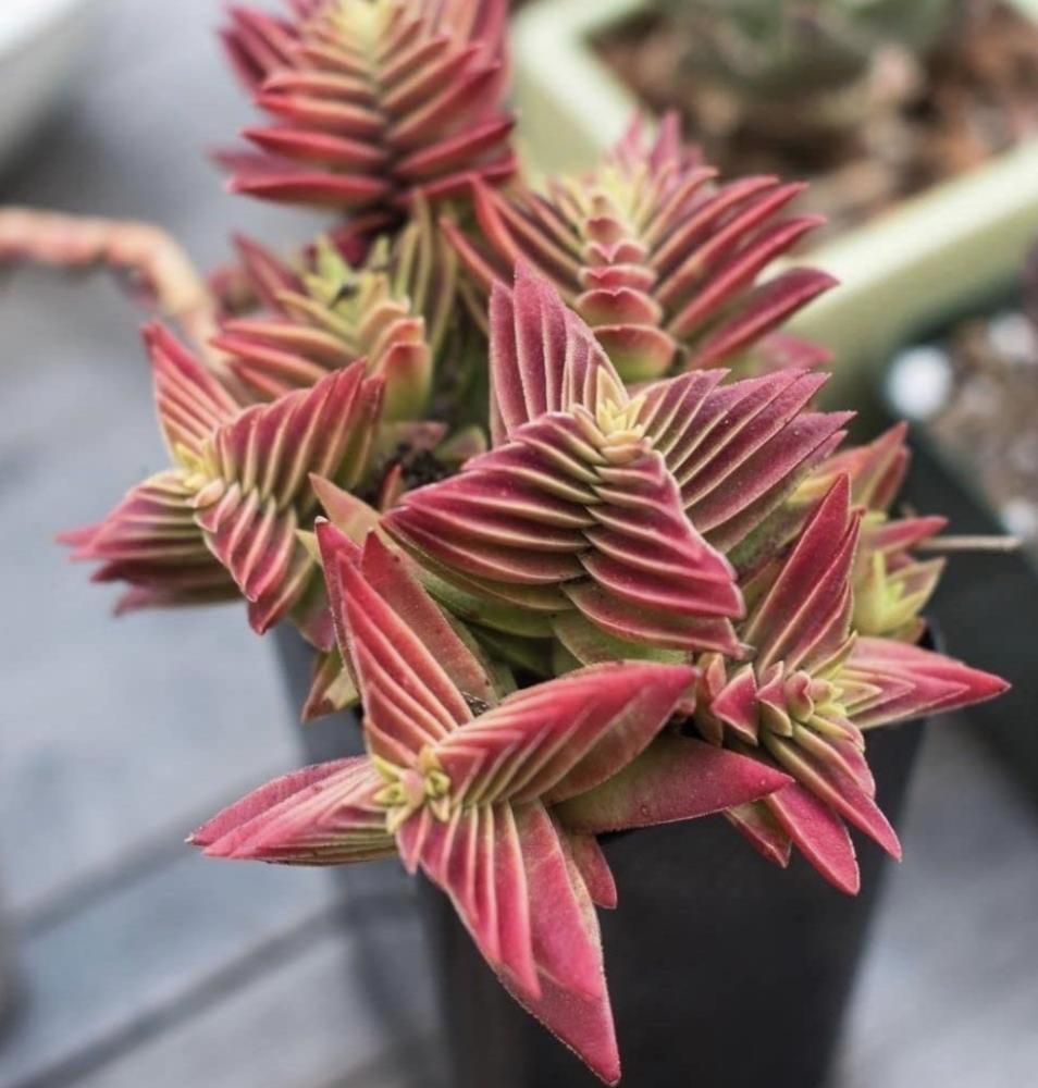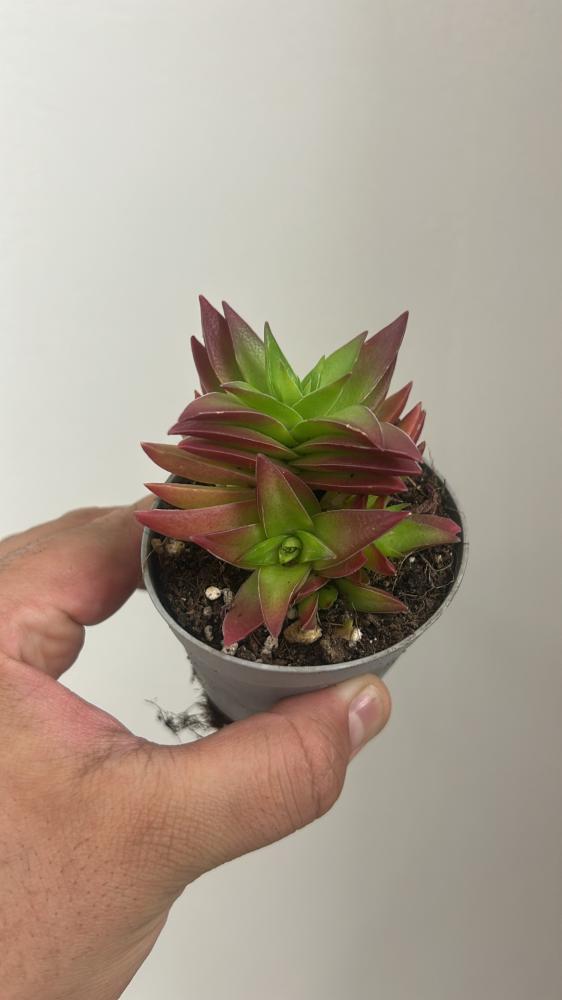 نبتة عصارية مذهلة بتدرجات لونها الأحمر الناري وتصميمها الهندسي اللافت، حيث تنمو أوراقها مثل الهرم الصغير بشكل متراص ومتناسق على الساق، وتتحول من الأخضر إلى الأحمر الداكن عند التعرض للضوء القوي. من أجمل العصاريات شكلاً وتدرجاً لونيًا!