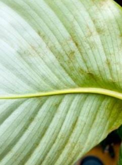 إذا كانت الأوراق مرقطة أو متقطعة ، مع تلف يشبه الوريد ، فتحقق من وجود العفن أو التربس أو سوس العنكبوت ، وإذا وجدت آفات ، فاستحم ورش بالماء والصابون الأخضر كل 8-10 أيام لمدة 3 أسابيع والحجر الصحي خلال هذه الفترة.