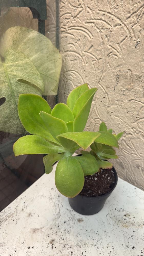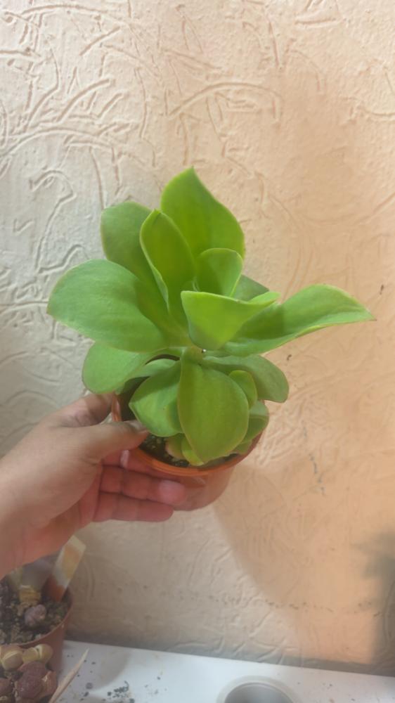 - الشكل: وردة عصارية بأوراق عريضة لامعة