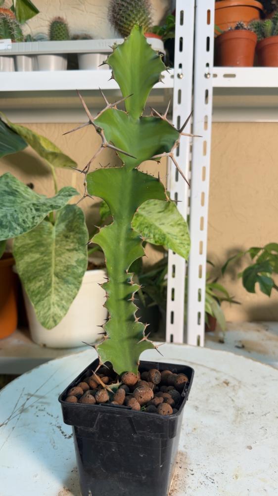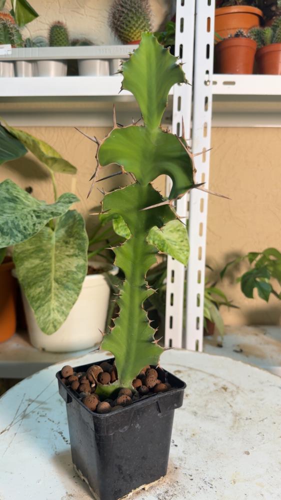 يُسمى أحيانًا “قرون البقر” بسبب شكل أفرعه الملتوية والشائكة. ورغم مظهره الشبيه بالصبار، فهو في الحقيقة من عائلة Euphorbiaceae (الفربيونيات). ينتج نسغًا أبيض سام يجب الحذر منه عند التقليم أو نقل النبتة.