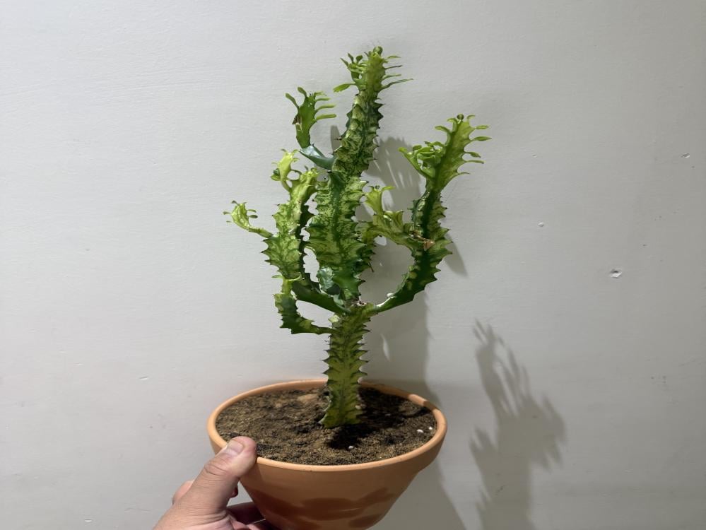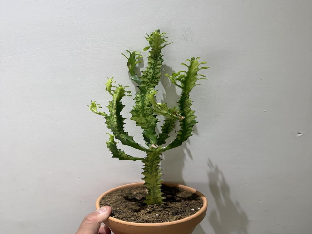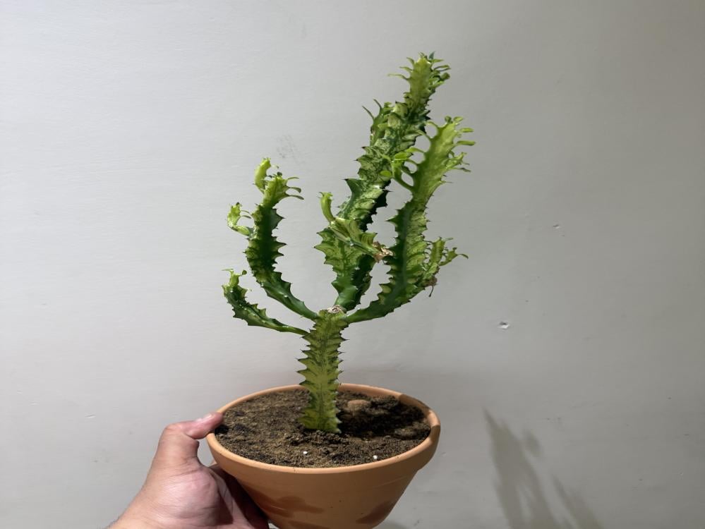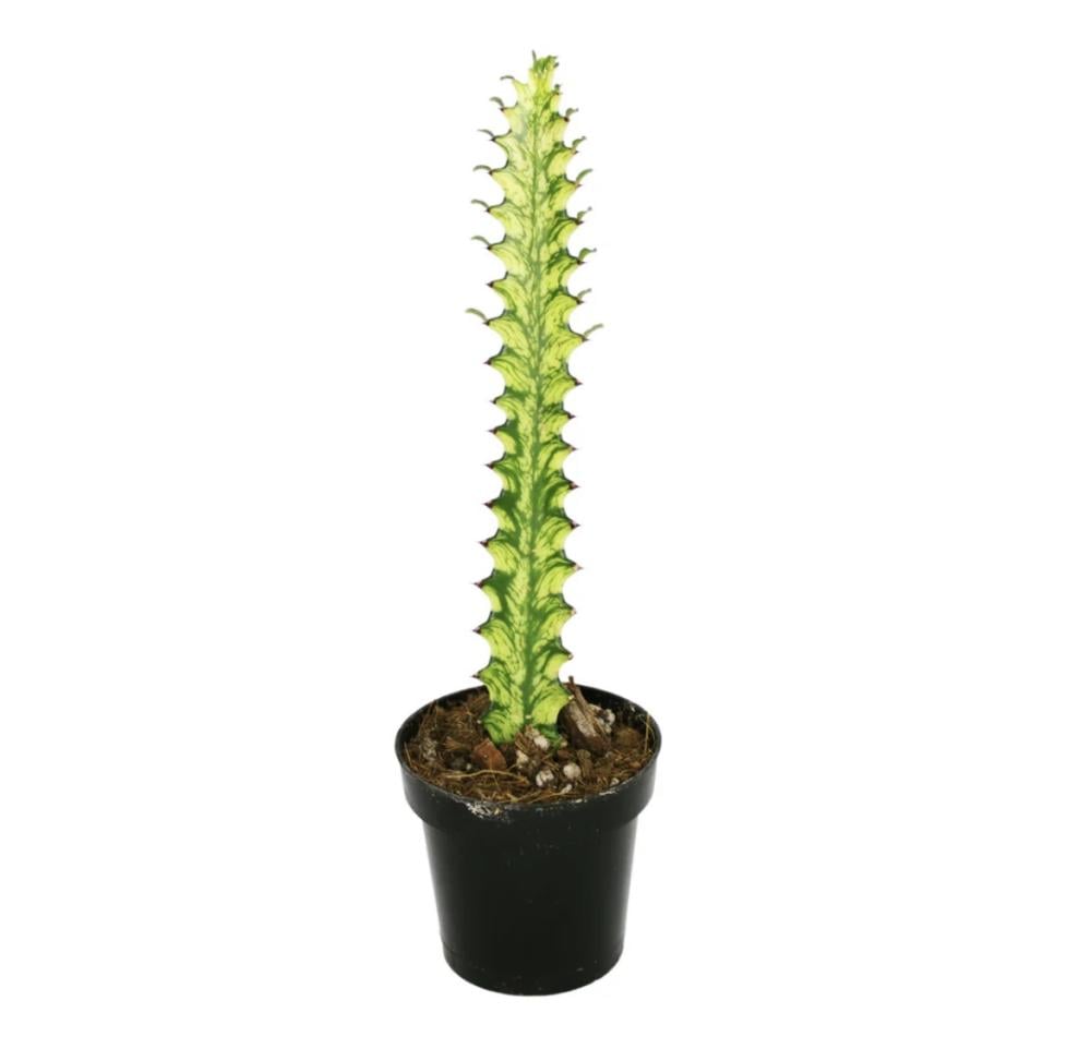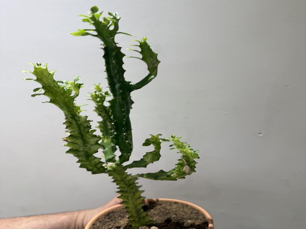 صبار عصاري مذهل يتميز بتفرعات عمودية أنيقة مع تلوّن فرقيتد يجمع بين الأخضر والكريمي وأحيانًا لمسات وردية عند التعرض لضوء جيد. شكله العمودي وجاذبيته الطبيعية يجعلان منه قطعة ديكور مثالية للمنازل والمكاتب.