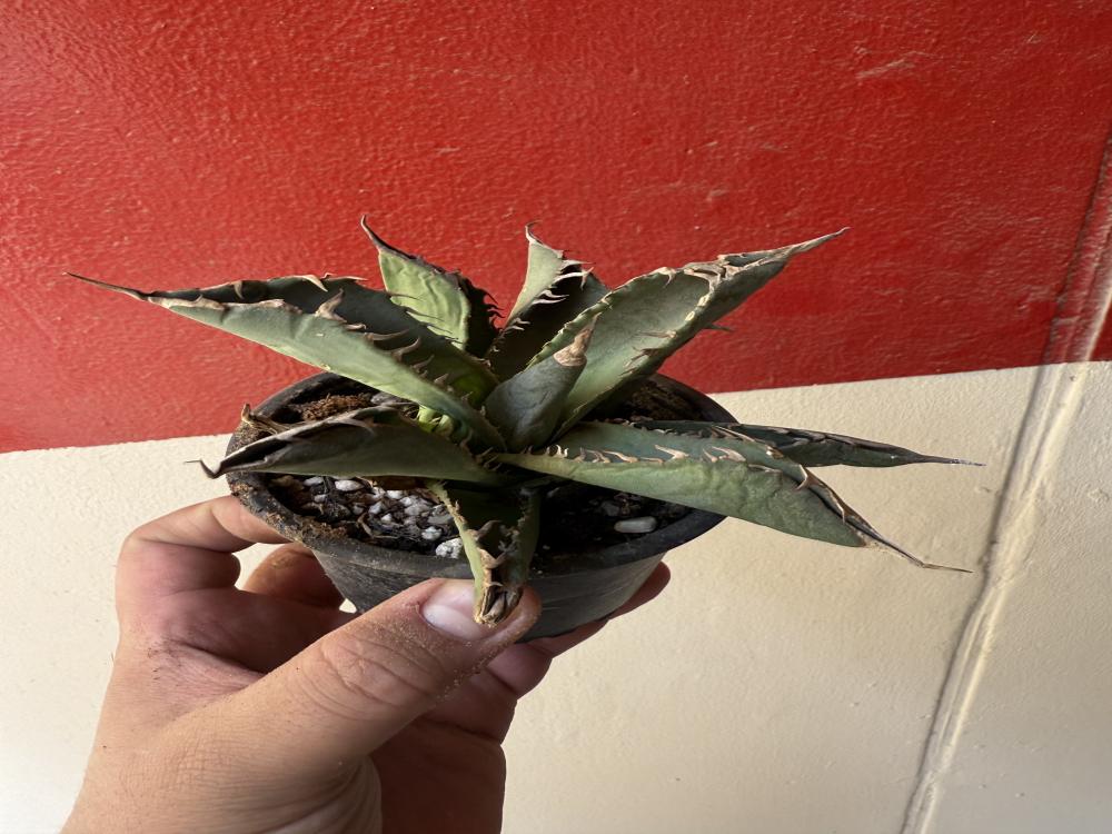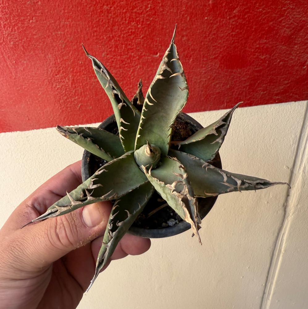 أضف لمسة جريئة إلى مجموعتك مع Agave titanota، واحدة من أجمل وأندر أنواع الأغاف، بأوراقها السميكة المتموجة وحوافها الشوكية البارزة التي تمنحها مظهراً مهيباً وفريداً. مثالية لهواة الصباريات والنباتات الصحراوية الفاخرة.