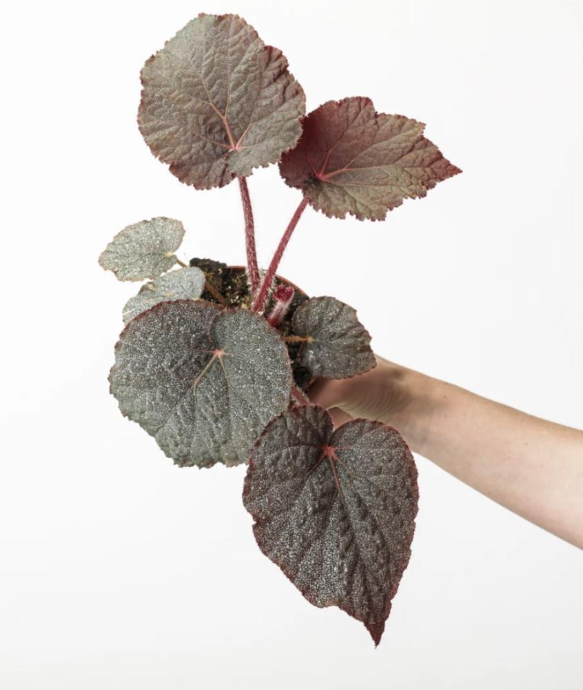 Begonia ‘Taconite’، تحفة نباتية داكنة تأسر الأنظار! أوراقها الفولاذية المخملية اللامعة تعكس درجات الأزرق والبنفسجي بشكل خيالي تحت الإضاءة. مثالية لمحبي النباتات المميزة ولمسات الفخامة في الزوايا المظللة من المنزل.