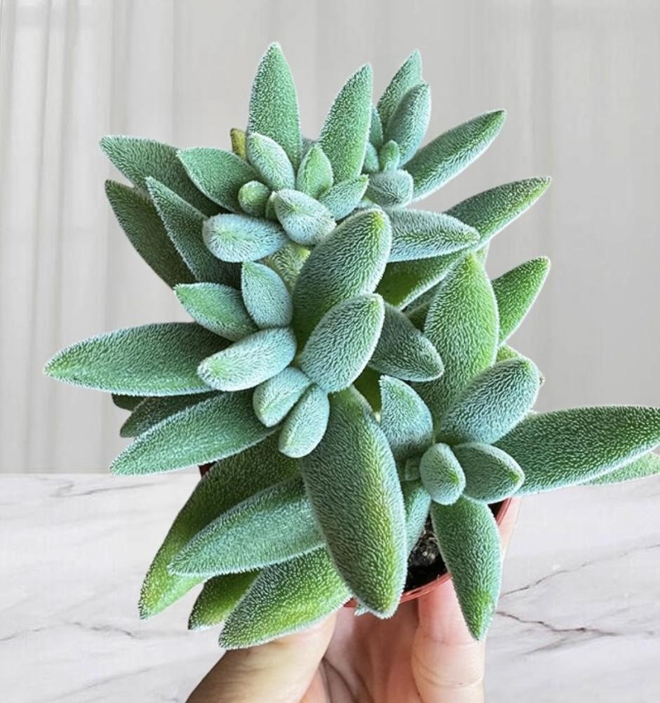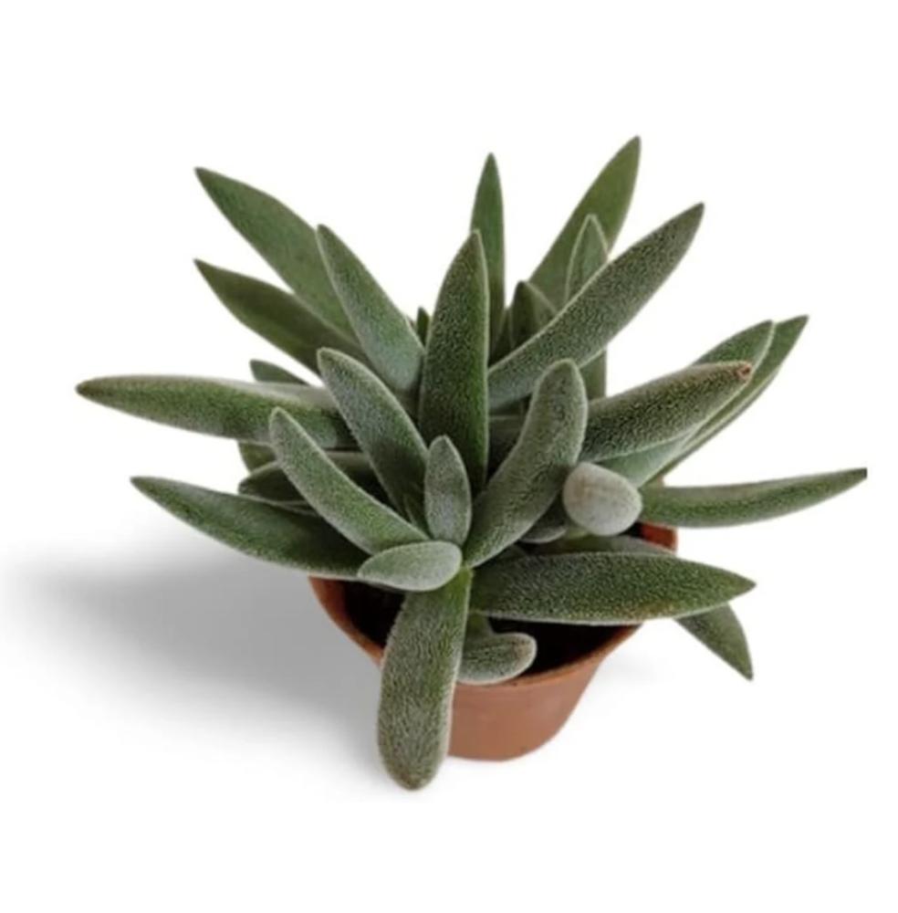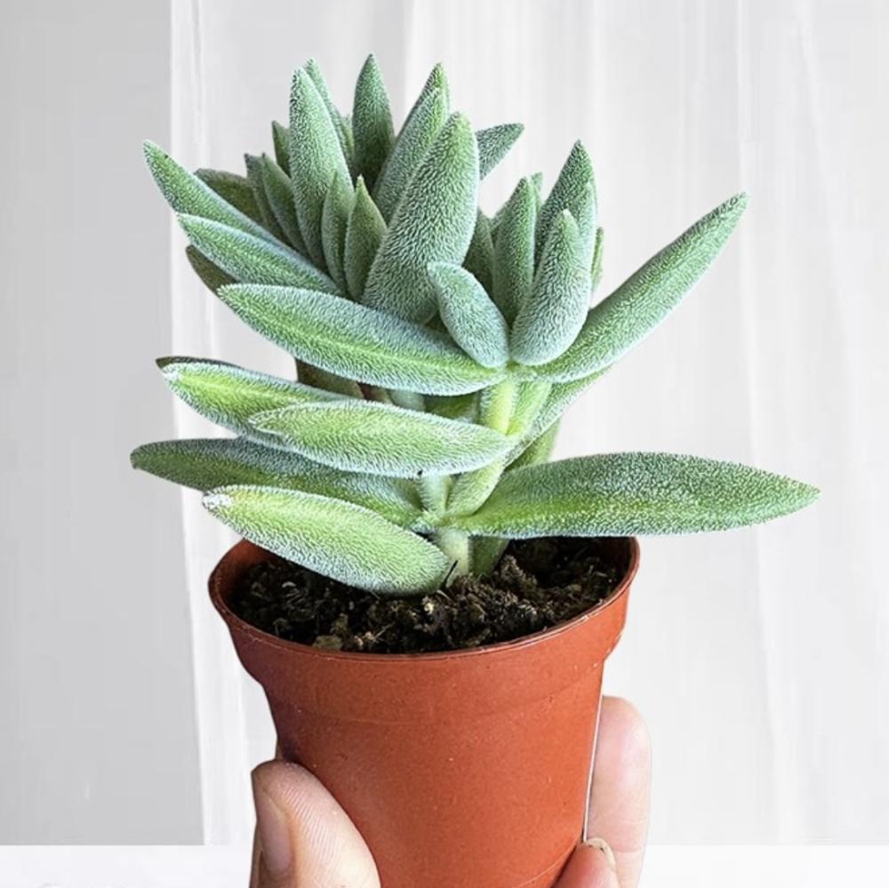 نبتة عصارية نادرة الشكل والملمس، تتميّز بأوراق ضيقة ومغطاة بشعيرات ناعمة فضية تُشبه أوراق النباتات الصحراوية أو الصوفية، مما يعطيها مظهرًا فريدًا ومخمليًا. تنمو بشكل منتصب وتُخرج أزهارًا صغيرة بيضاء في الشتاء.