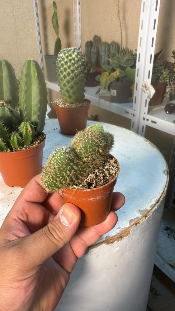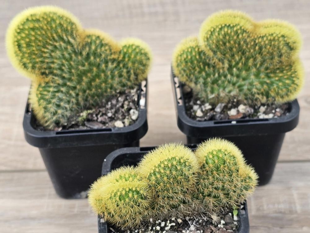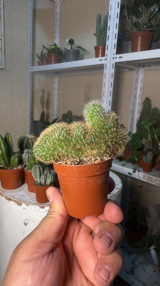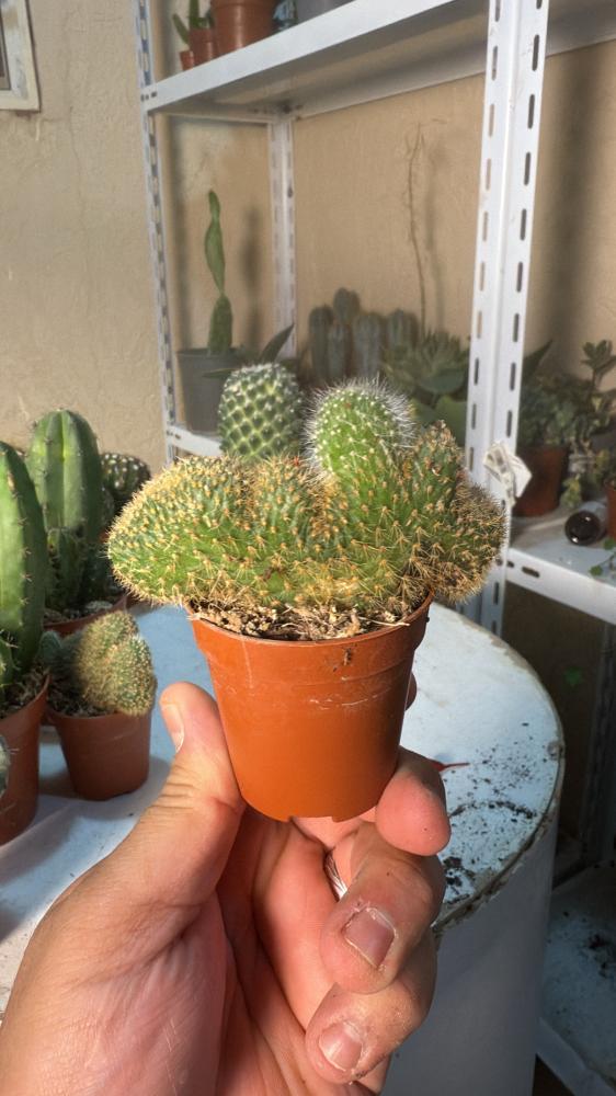 صبار نادر ومميز بشكله المروحي (Crested) الذي يعطيه مظهرًا زخرفيًا فنيًا يشبه الأمواج أو الأدمغة الصغيرة. يُعرف أيضًا باسم Golden Rat Tail Cactus (Crested) بسبب أشواكه الذهبية القصيرة التي تغطي سيقانه المتعرجة.