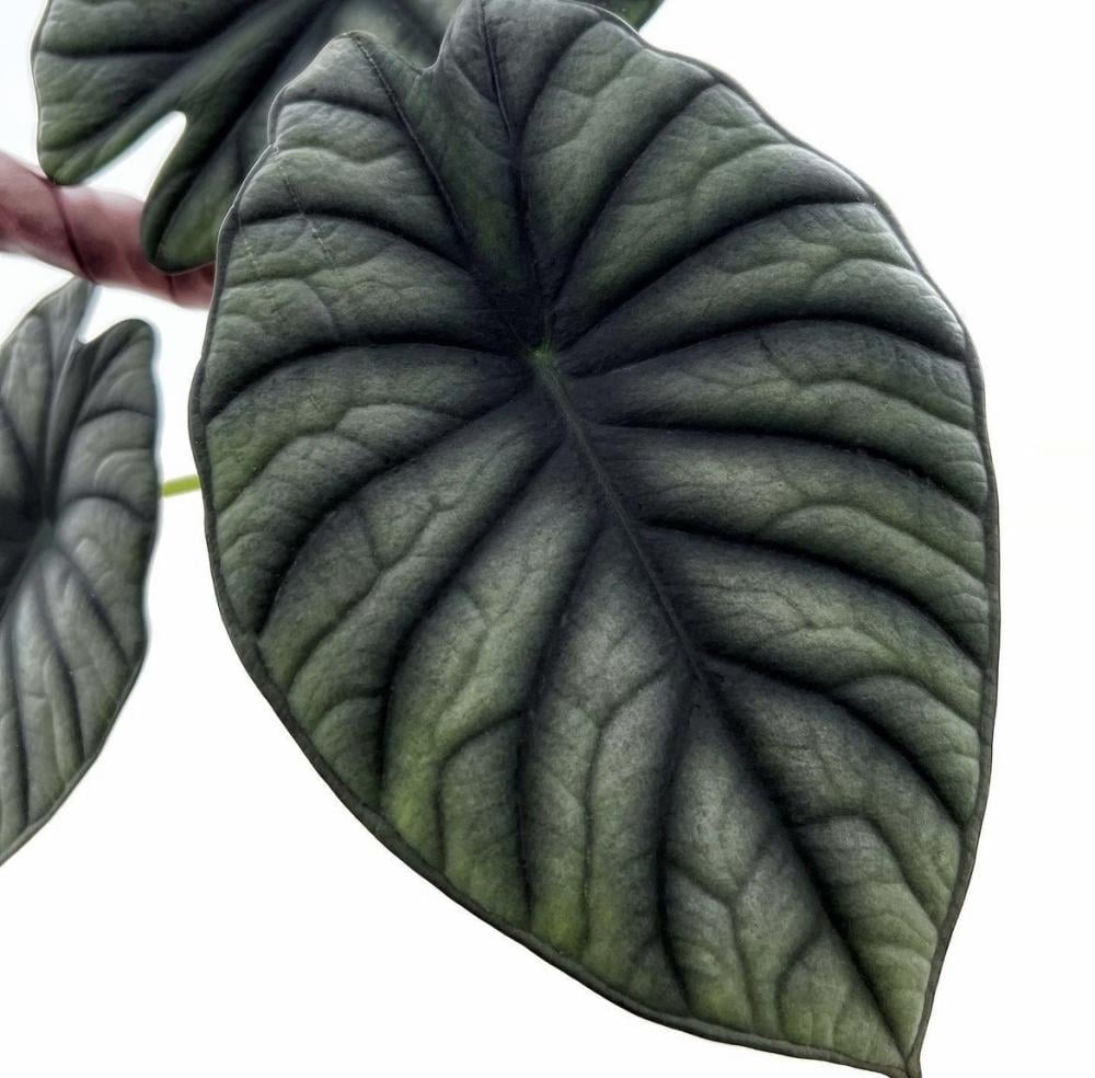 تتميّز بأوراق ضخمة ومخملية بلمعة معدنية، تجمع بين درجات الرمادي، الأخضر الداكن، والأزرق الفحمي، مع عروق غائرة تجعل كل ورقة تبدو كأنها منحوتة يدويًا.