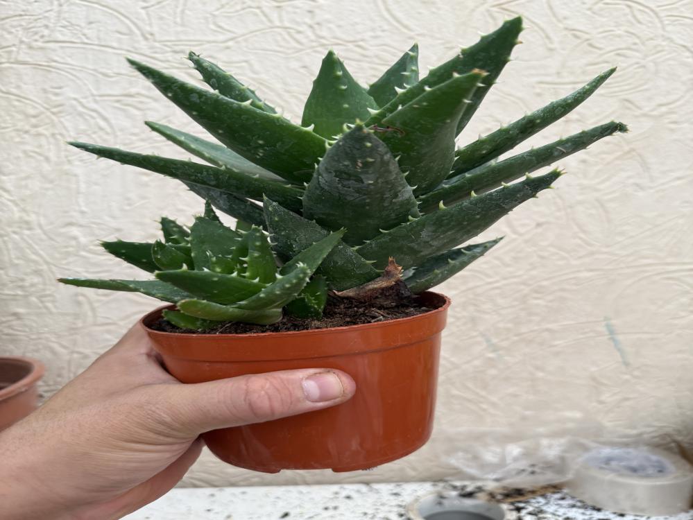 يُطلق عليها أيضًا "Mitre Aloe"، نبتة عصارية قوية بأوراق مثلثة سميكة ذات لون أخضر مائل للرمادي، مزودة بأشواك ناعمة بيضاء على الحواف. تنمو في شكل وردة متناسقة وتُزهر في الصيف بأزهار برتقالية أو حمراء زاهية، ما يضيف لها لمسة برّاقة.