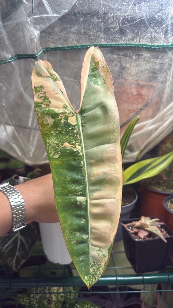 نبتة نادرة واستثنائية لعشاق النوادر! تتميز بأوراقها الطويلة المميزة وعروقها البرتقالية، تتخللها تلوينات وردية ساحرة غير منتظمة تجعل كل ورقة تحفة فنية فريدة. هذه النبتة من النوادر عالية القيمة، وغالبًا ما تكون محط أنظار في أي مجموعة نباتات نادرة.