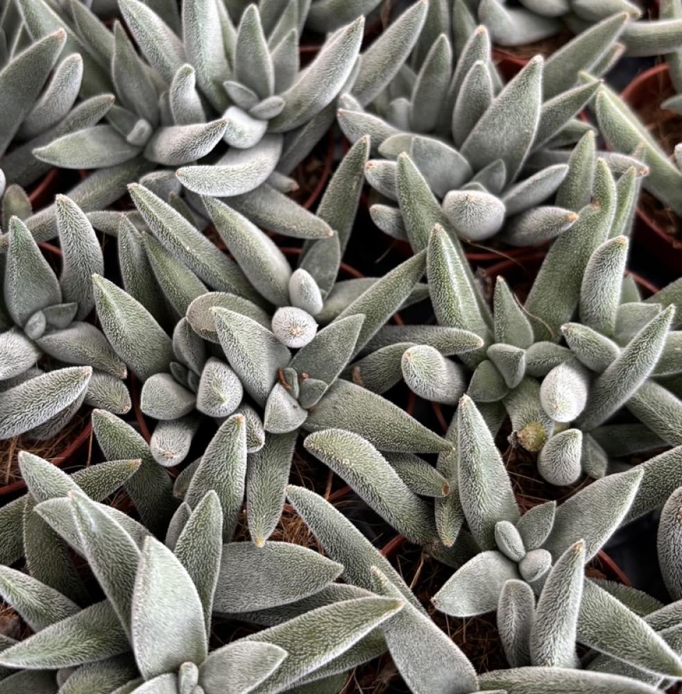 نبتة عصارية مميزة ونادرة، أوراقها صغيرة وكثيفة بلون أخضر فاتح مغطاة بطبقة فضية خفيفة تعطيها لمعة فريدة كأن عليها ندى فضي! 🌿💫