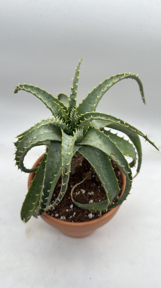 الشكل: أوراق طويلة منحنية خضراء إلى رمادية، مسننة بحواف شوكية.