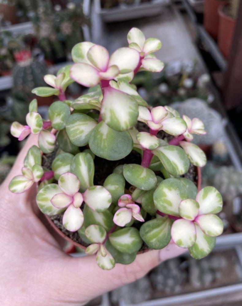 نبتة Portulacaria afra ‘Mediopicta’ وتُعرف أيضًا بـ”اليشم القزمي المبرقش” أو “الفيل المبرقش” هي صنف جميل ونادر من البورتولاكاريا، يتميز بأوراق صغيرة بيضاوية بلون أخضر باهت تتوسطها خطوط كريمية أو صفراء، مع سيقان حمراء إلى بنفسجية، ما يمنحها جاذبية بصرية فريدة.