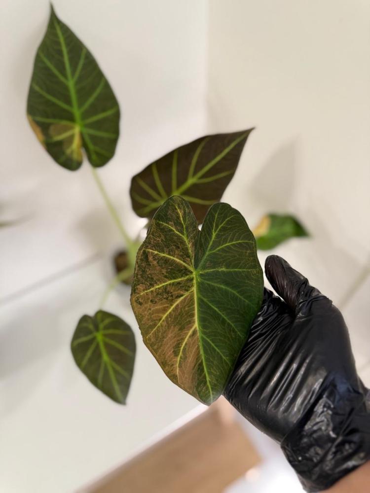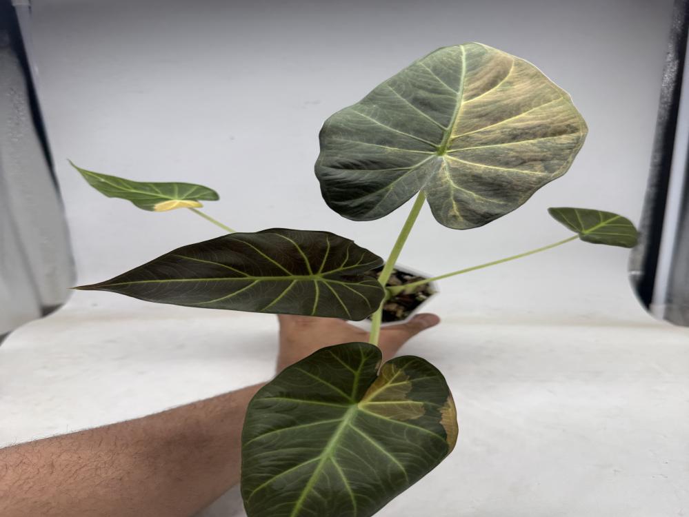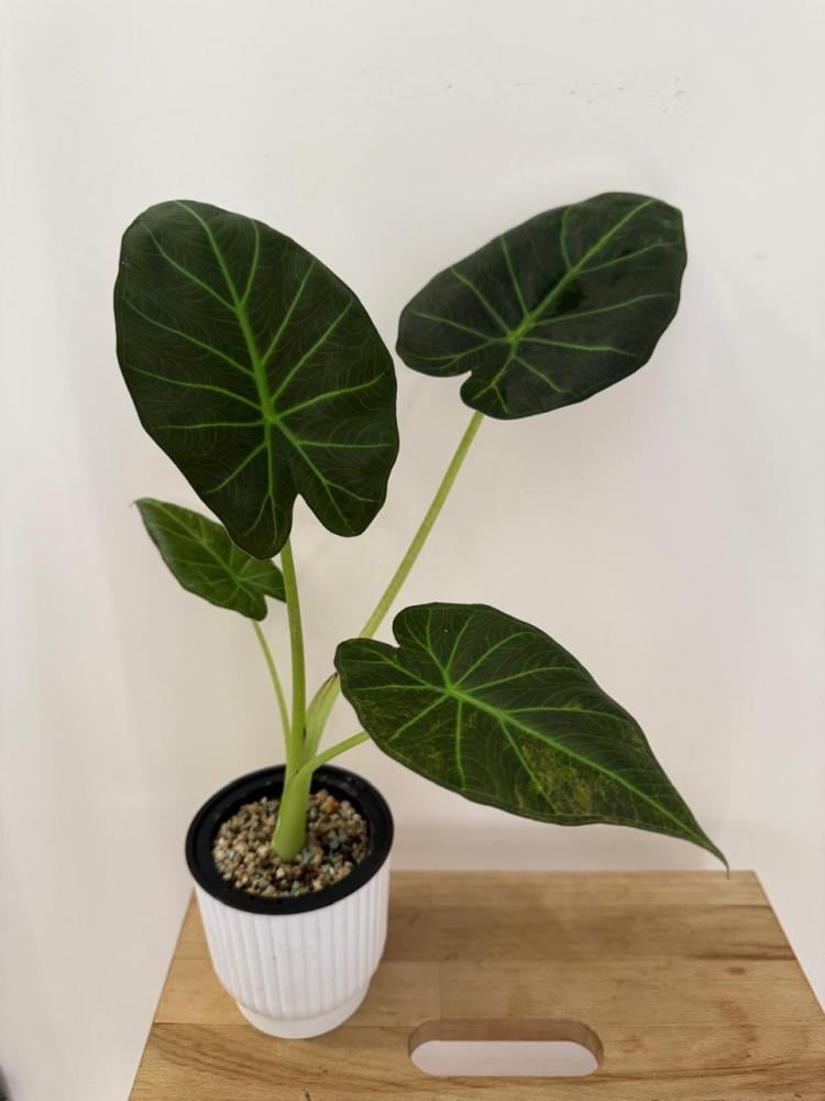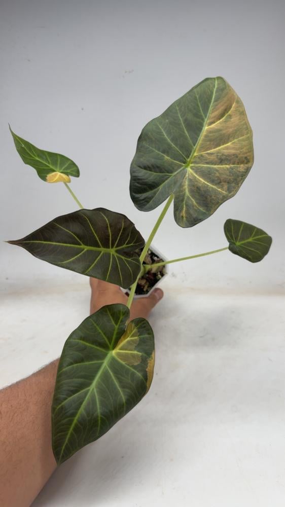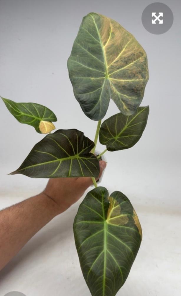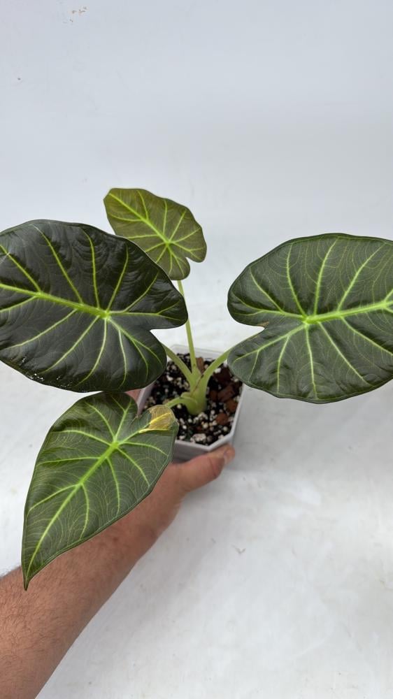 نبتة نادرة جدًا من الألوكاسيا، أوراقها كبيرة مخملية الملمس باللون الأخضر العميق مع عروق بارزة، يزينها تباين فارفيقاتد باللون الوردي الذي يضفي عليها لمسة فاخرة لا تتكرر. شكل الأوراق شبيه بالدرع، ما يجعلها نبتة عرضية استثنائية.