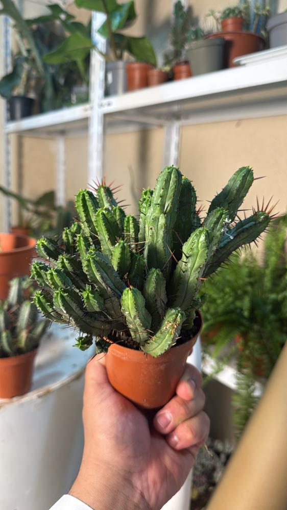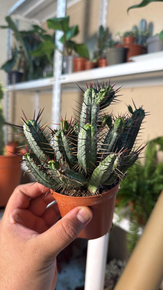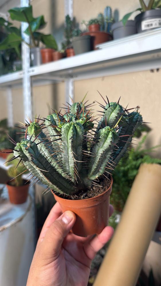 يوفوربيا إينوبلا هي عصارية فريدة من نوعها تشبه الصبار، وتتميّز بسيقان خضراء مضلعة تحمل أشواكًا حادة وطويلة، غالبًا ما تكون أرجوانية أو حمراء داكنة. تنمو على شكل تجمّعات كثيفة ومظهرها جذاب جداً لهواة النباتات الغريبة.