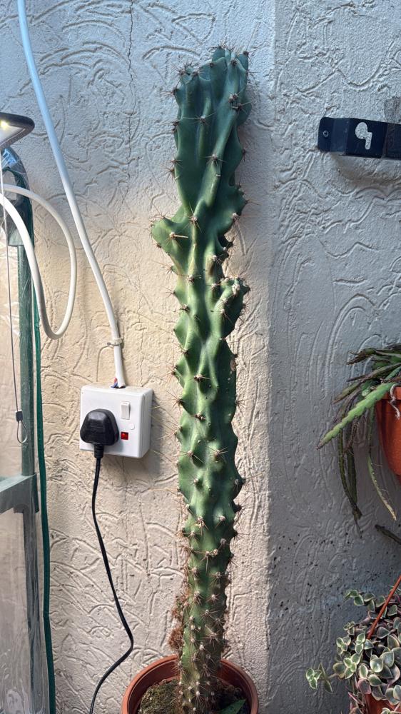 - الشكل: تنمو النبتة بأعمدة متعرجة وغير منتظمة، مع نتوءات ومنحنيات غير متماثلة، بعكس الشكل العمودي المعتاد للـCereus.