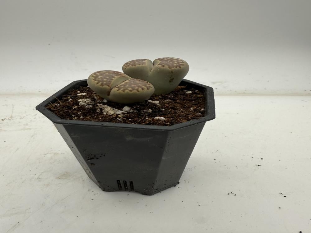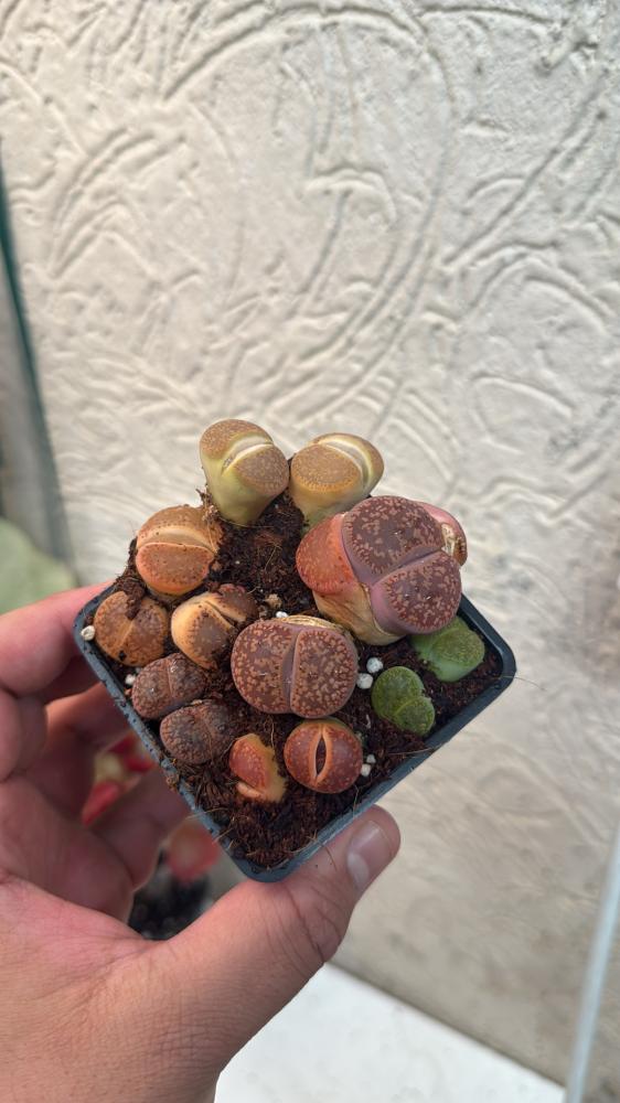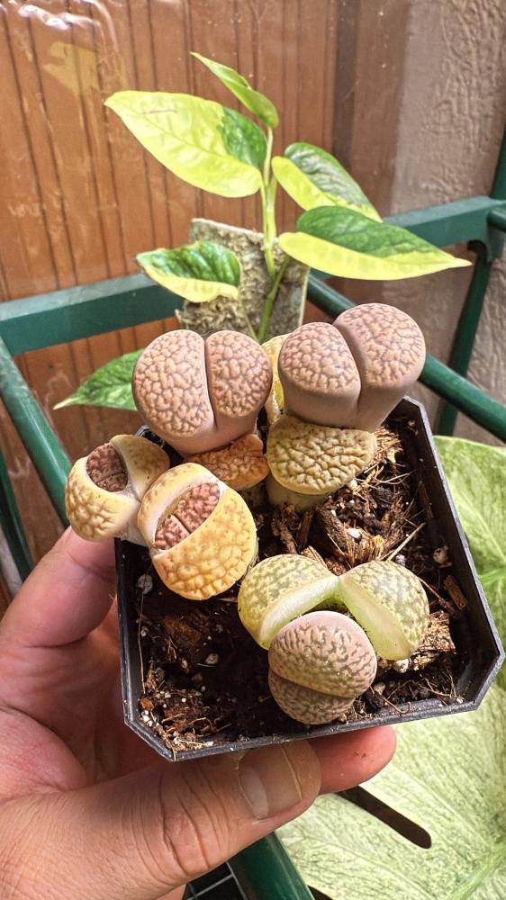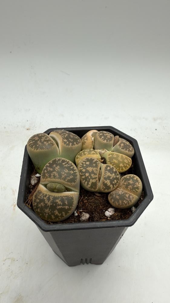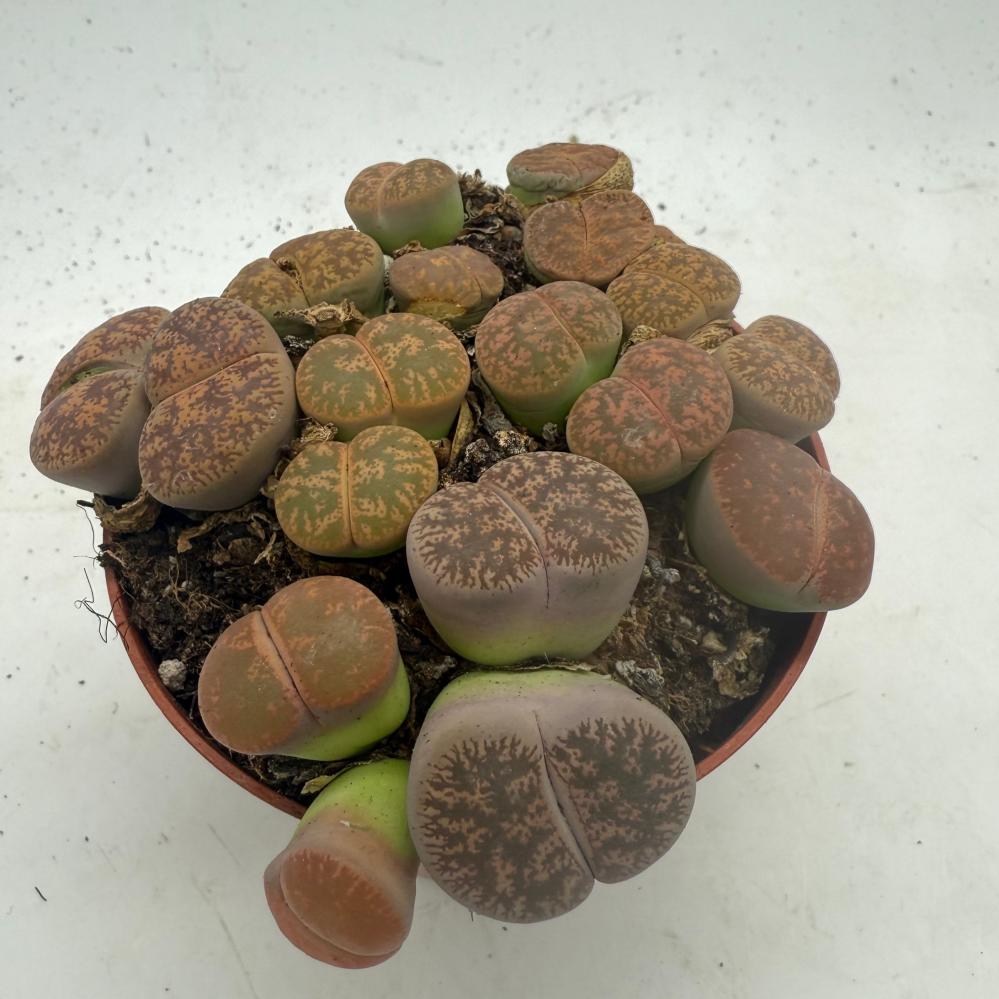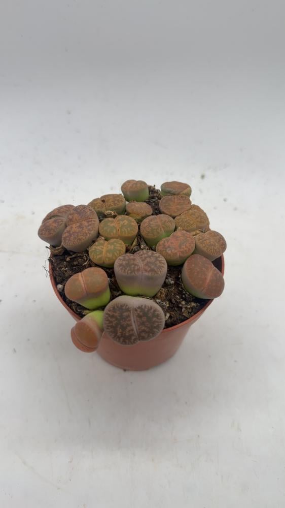نبتة عصارية نادرة وغريبة الشكل، تُشبه الحصى الصغيرة لكنها حيّة! تتكون من ورقتين لحميتين ملتصقتين بلون رملي منقّط أو مائل للبرتقالي/البني، وتُزهر أحيانًا بزهرة صفراء أو بيضاء مذهلة. هذه النبتة تتقن فن التمويه، وتُعد من أجمل النباتات للعرض في الأصص الصغيرة.