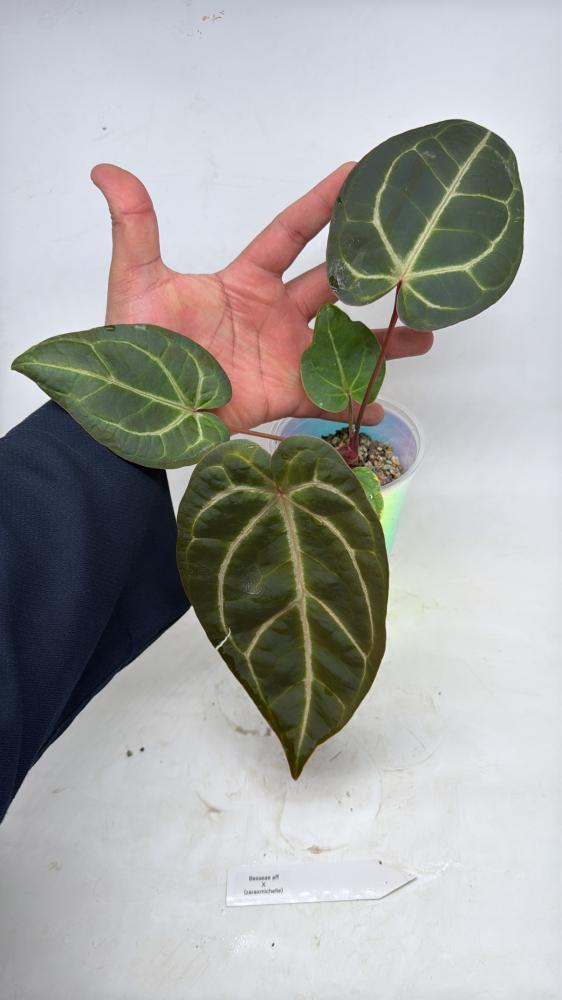يحمل هذا الهجين اسمًا مركّبًا يشير إلى دمج صفات besseae aff المعروفة بأوراقها المخملية الداكنة مع تهجين Zara × Michelle الذي أضفى فخامة في الشكل وعمقًا في اللون. النتيجة نبتة بأوراق عريضة قلبية، ذات عروق بارزة ولمعة مخملية فاخرة تجعلها من أجمل الأنثوريومات الهجينة.